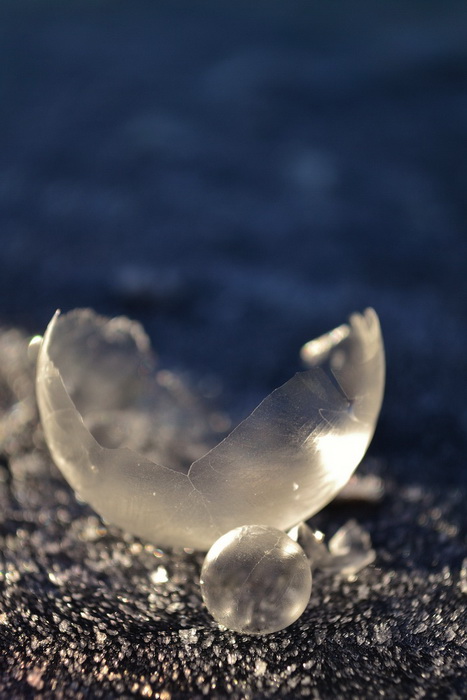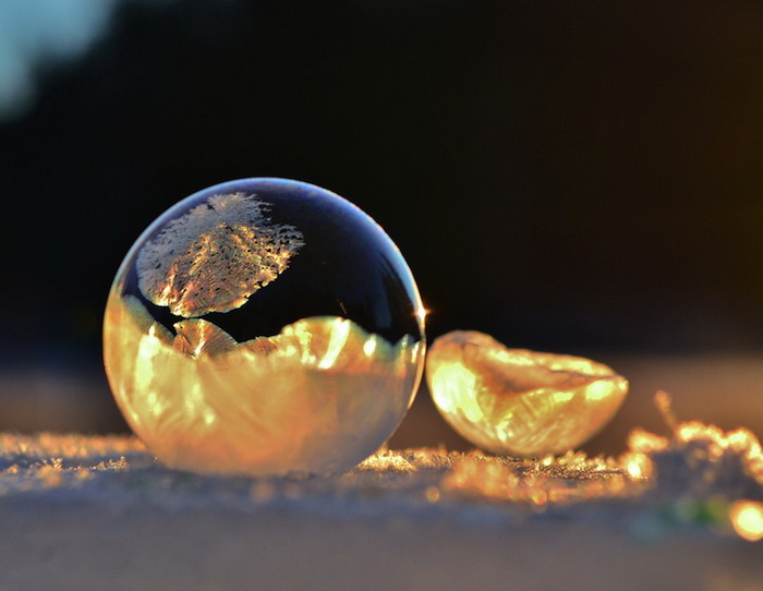 Утренней температуры в 9-12 градусов мороза хватало для того, чтобы пузыри хорошенько замерзали. На глазах у фотографа и ее изумленного сына тончайшие стенки мыльных пузырей кристаллизировались, и они вдруг становились похожи на хрустальные шары. Одни пузырьки моментально застывали в воздухе, падали на землю и разбивались, другие же – «схватывались» уже приземлившись и сохраняли форму.