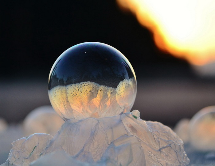 Анджела Келли сфотографировала лучи восходящего солнца, отраженные на стенках замерзших пузырей. Пузыри, кстати, Анджела делала вместе со своим сыном в домашних условиях, использовав для этого обыкновенный мыльный раствор.